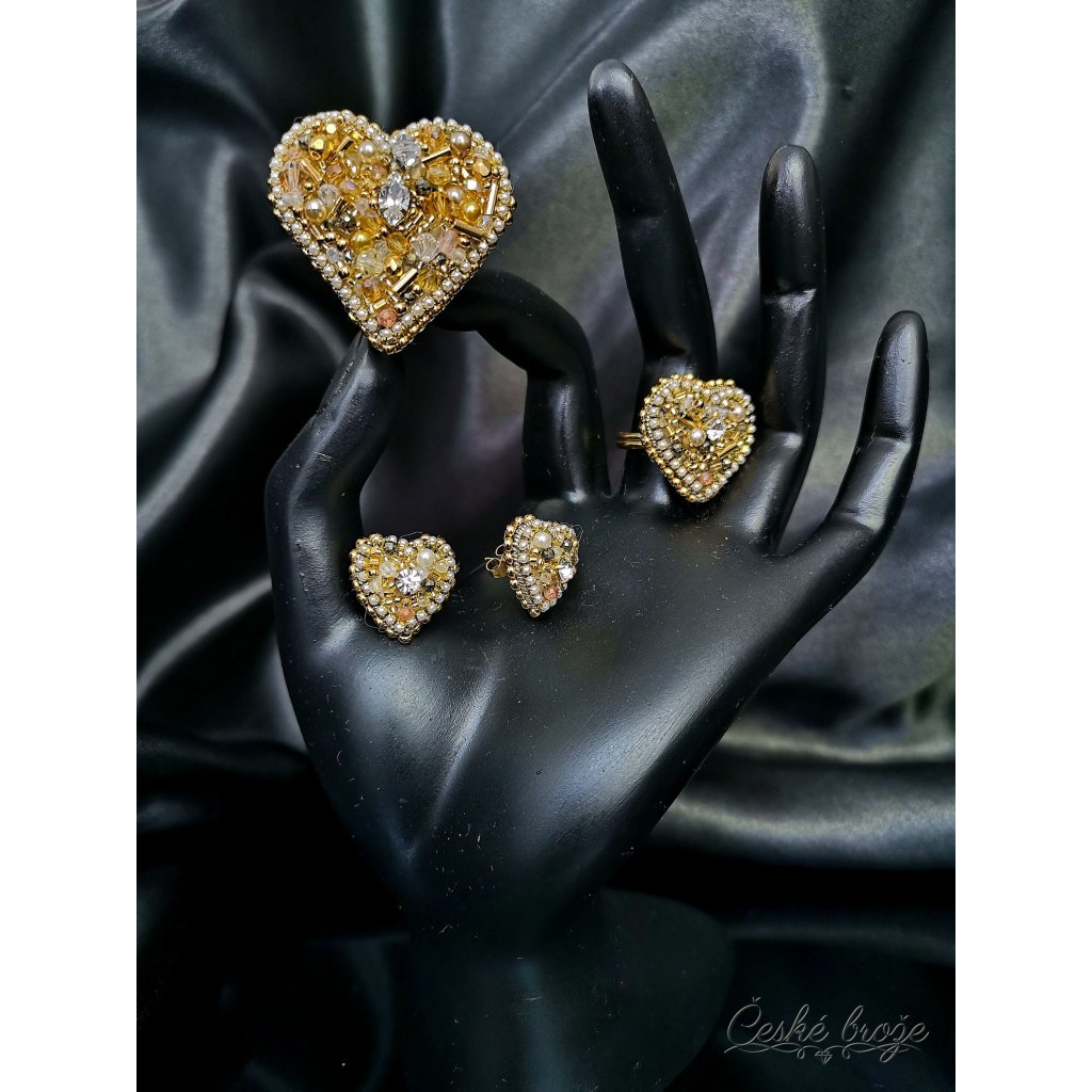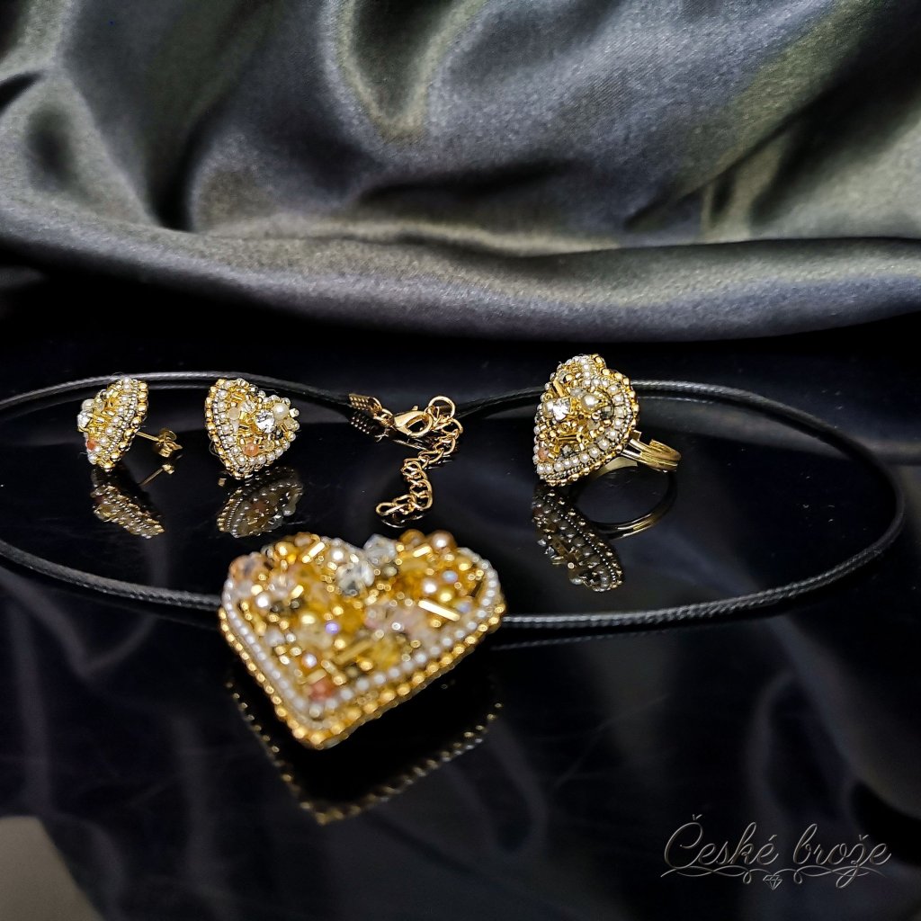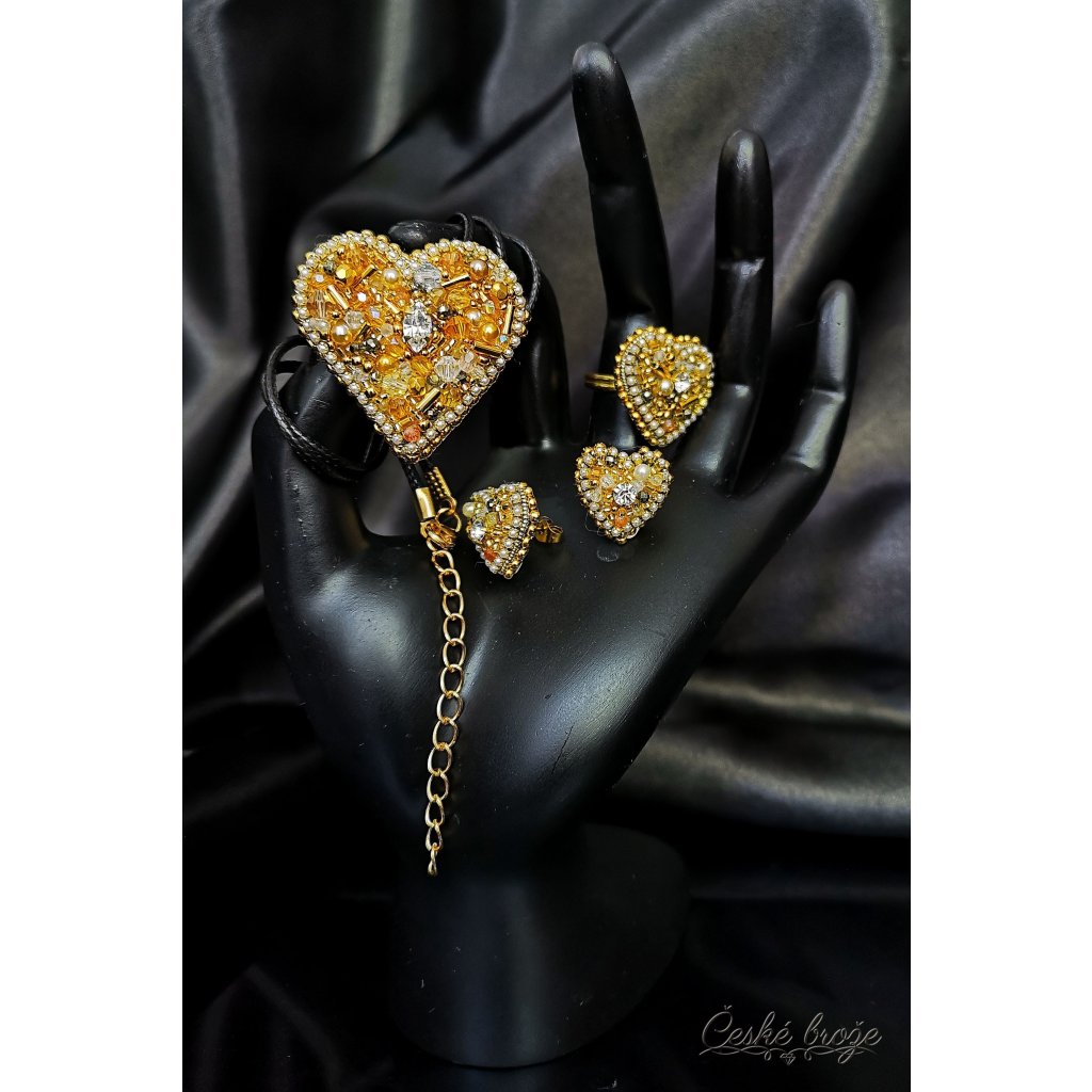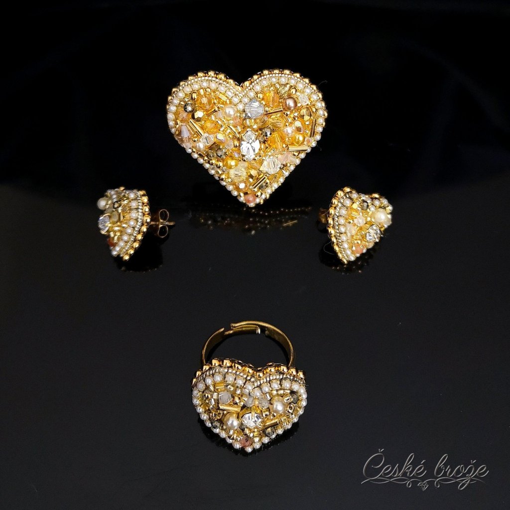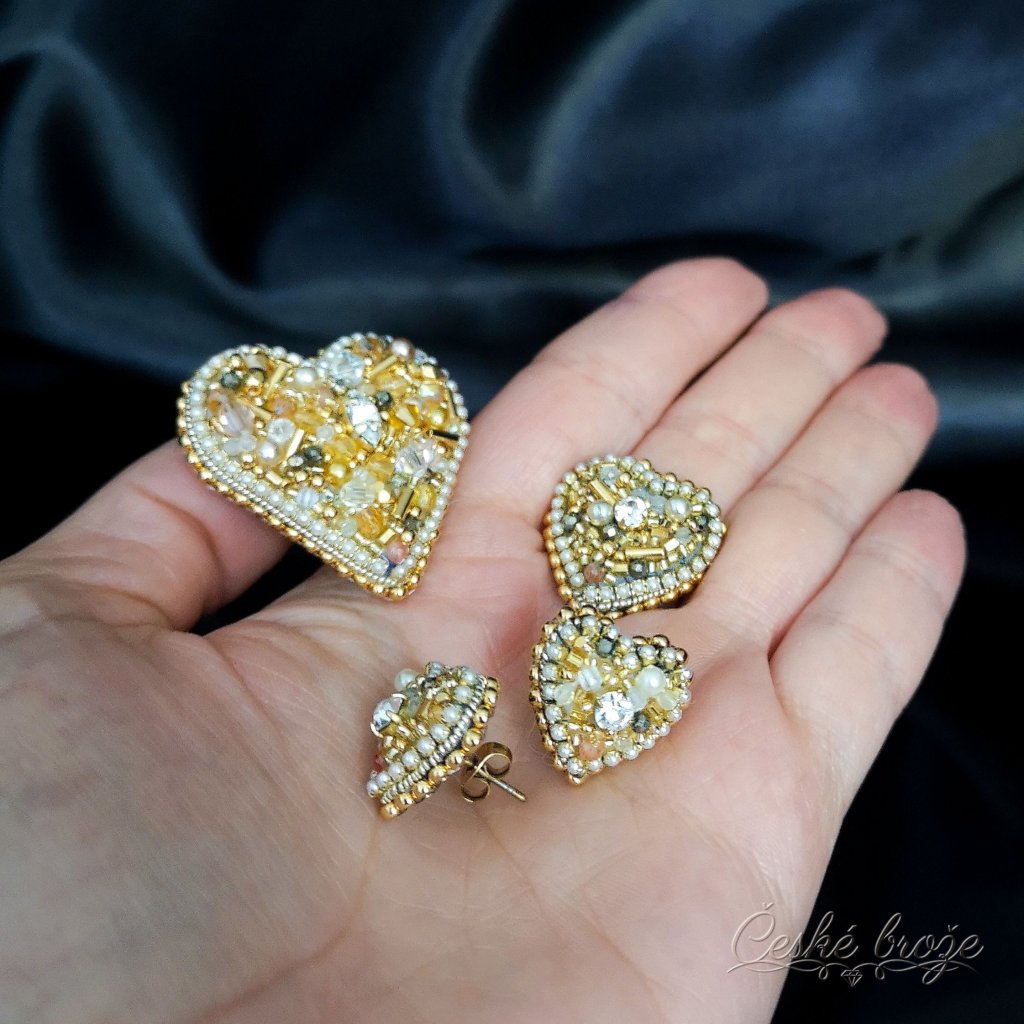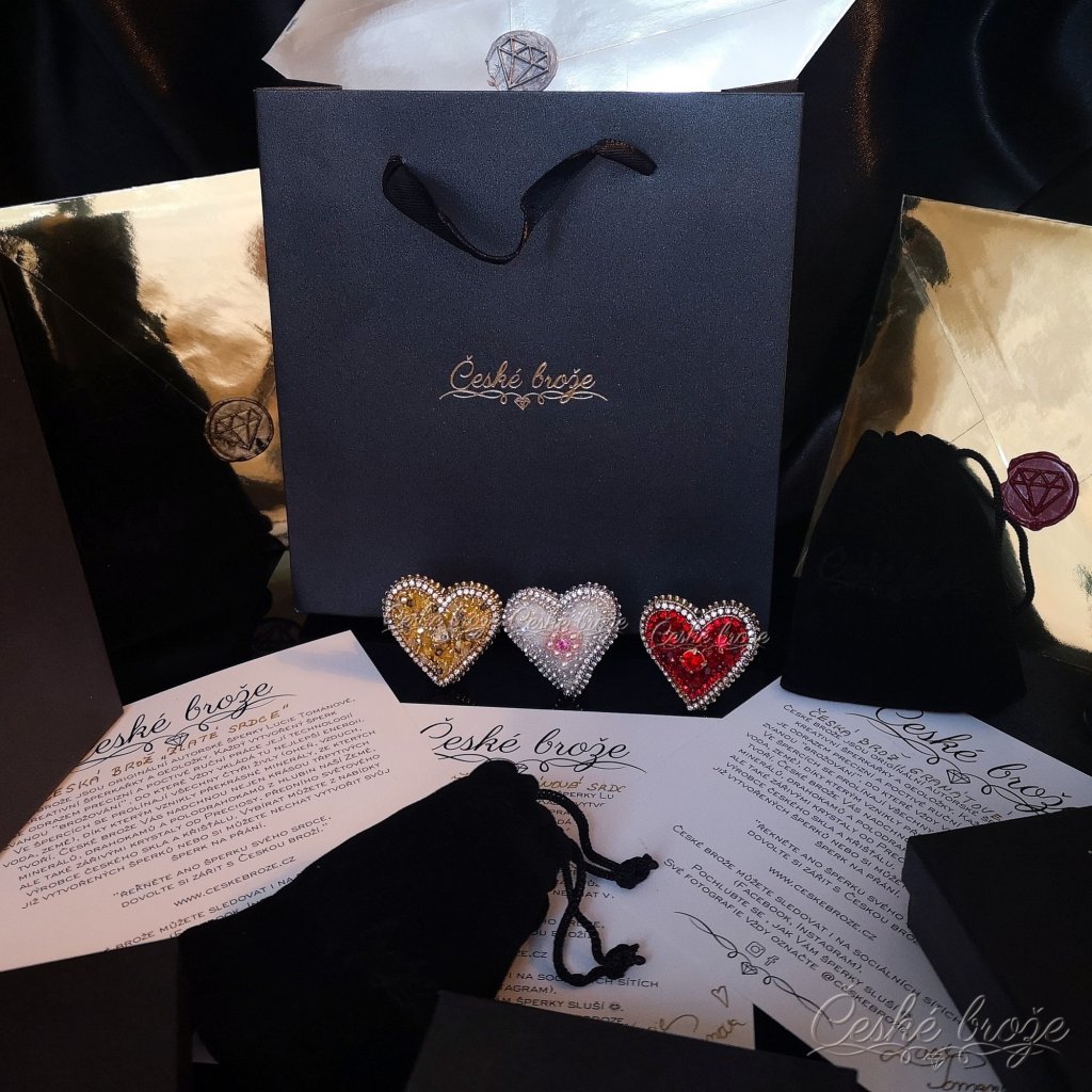 Česká brož Zlaté srdce patří do kolekce, kterou jsem nazvala "Ze srdce pro Tebe". Do této kolekce postupně přidávám dle vašich přání další šperky ve tvaru srdce (další České brože, náhrdelníky, prsteny a náušnice), jen se budou lišit barvou a zasazenými perlemi, perličkami, krystaly a minerály. Pokud si přejete celý tento set nebo jen některý šperk z něj v této zlaté variantě, vložte jej do košíku a pokračujte dle instrukcí. Pokud si přejete jinou barevnou variantu, vložte tento šperk do košíku a do poznámky napište Vaše přání nebo mě kontaktujte telefonicky.