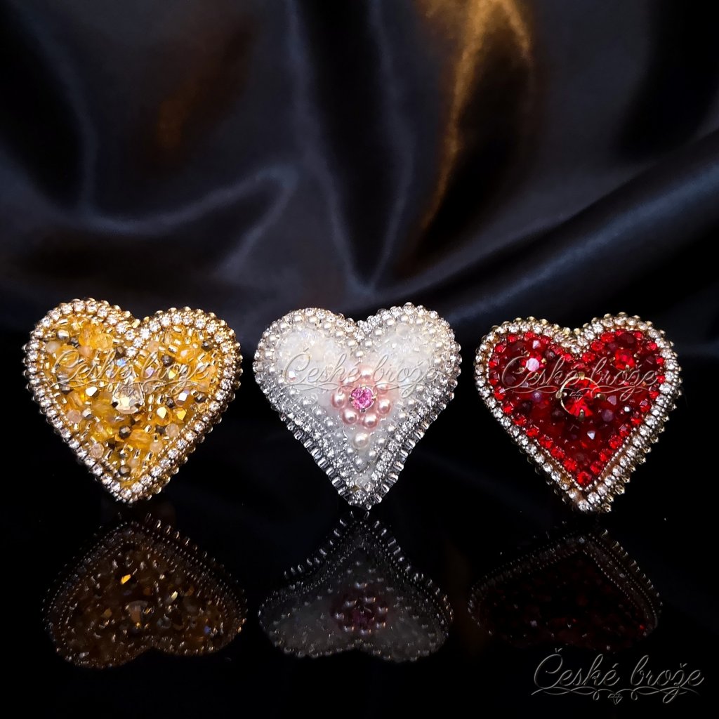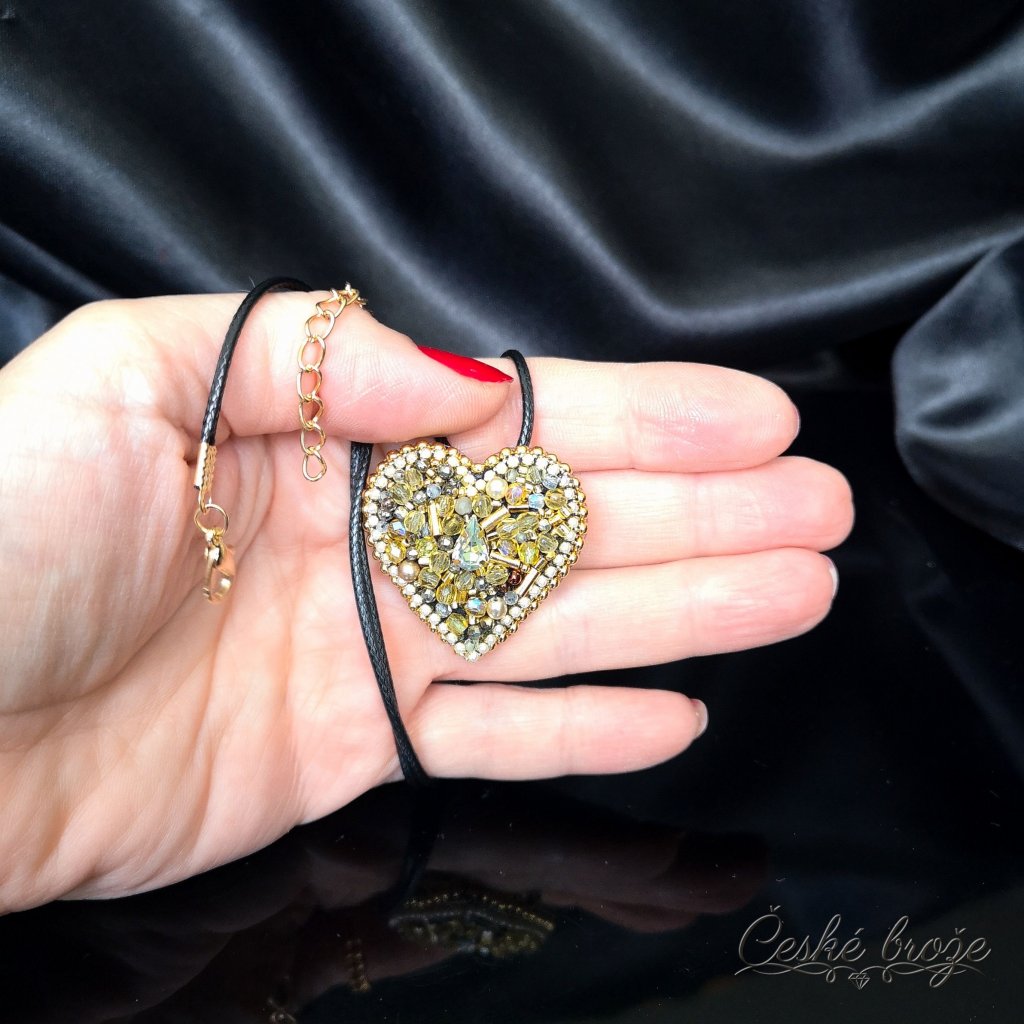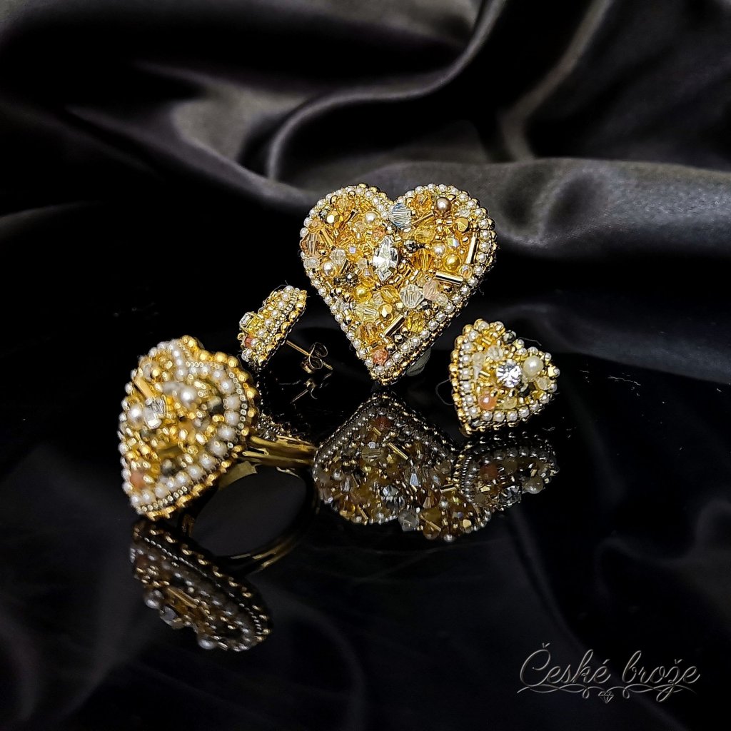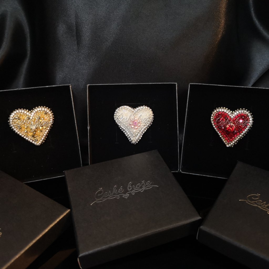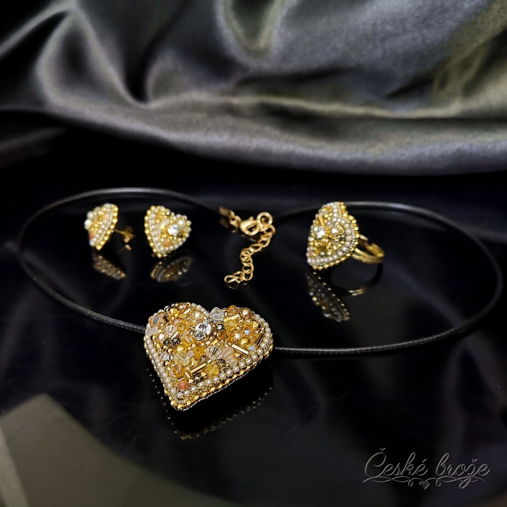 Česká brož Zlaté srdce patří do kolekce, kterou jsem nazvala "Ze srdce pro Tebe". Do této kolekce postupně přidávám dle vašich přání další šperky ve tvaru srdce (další České brože, náhrdelníky, prsteny a náušnice), jen se budou lišit barvou a zasazenými perlemi, perličkami, krystaly a minerály. Pokud si přejete celý tento set nebo jen některý šperk z něj v této zlaté variantě, vložte jej do košíku a pokračujte dle instrukcí. Pokud si přejete jinou barevnou variantu, vložte tento šperk do košíku a do poznámky napište Vaše přání nebo mě kontaktujte telefonicky.