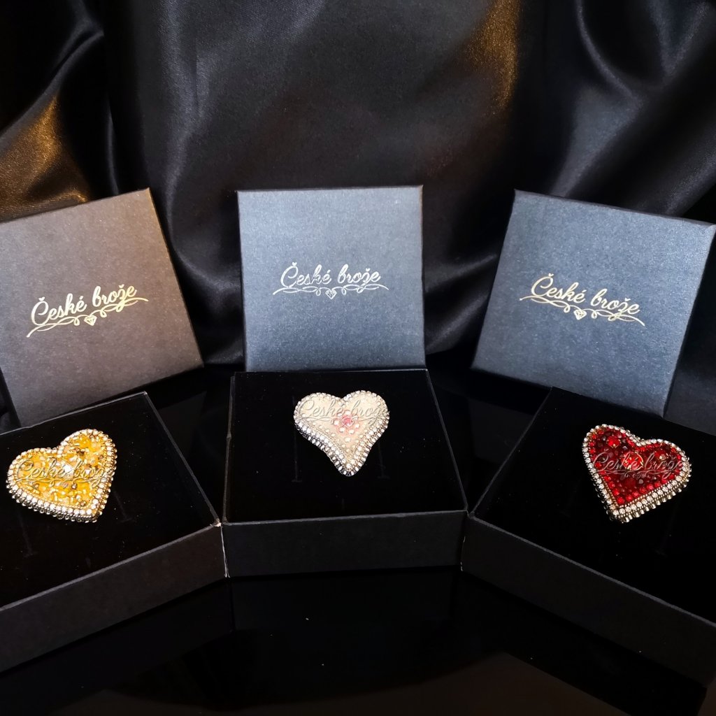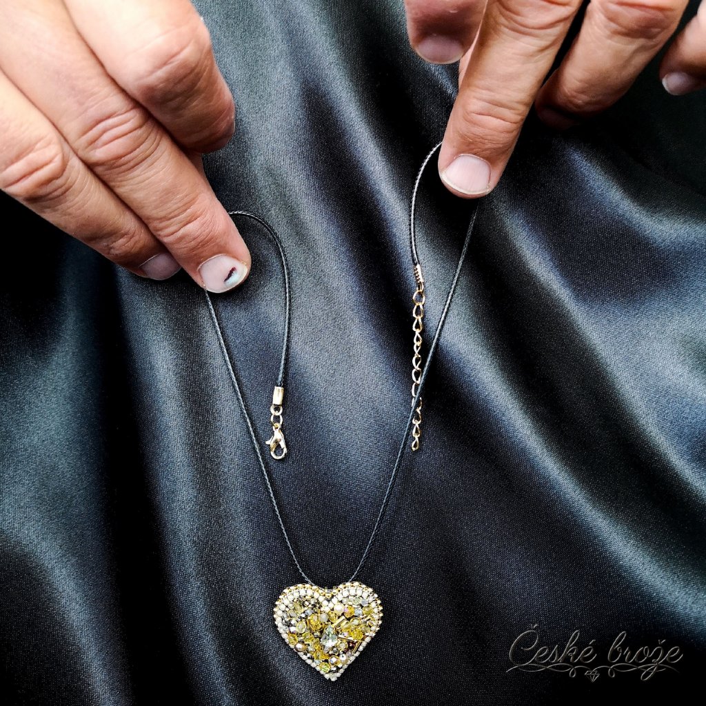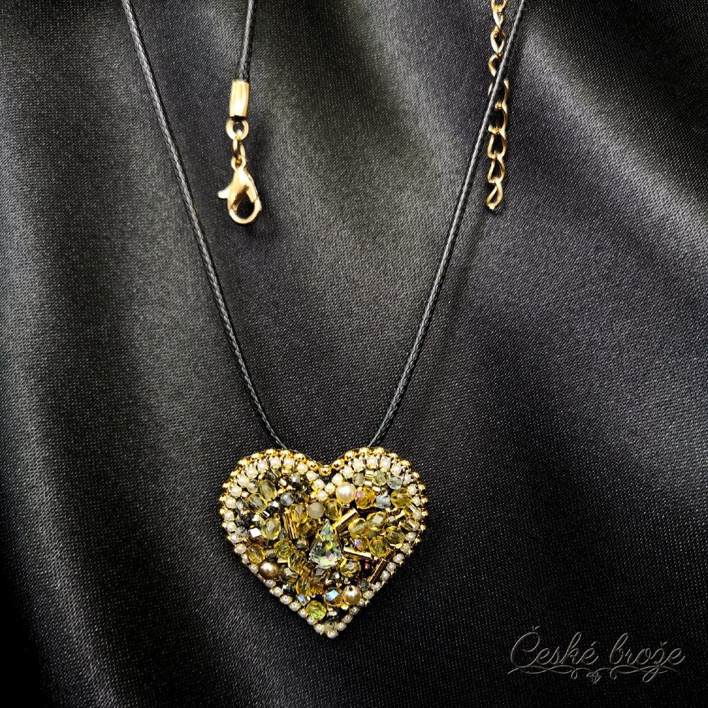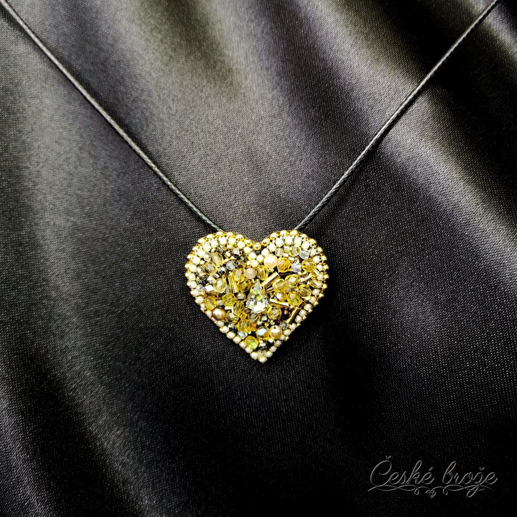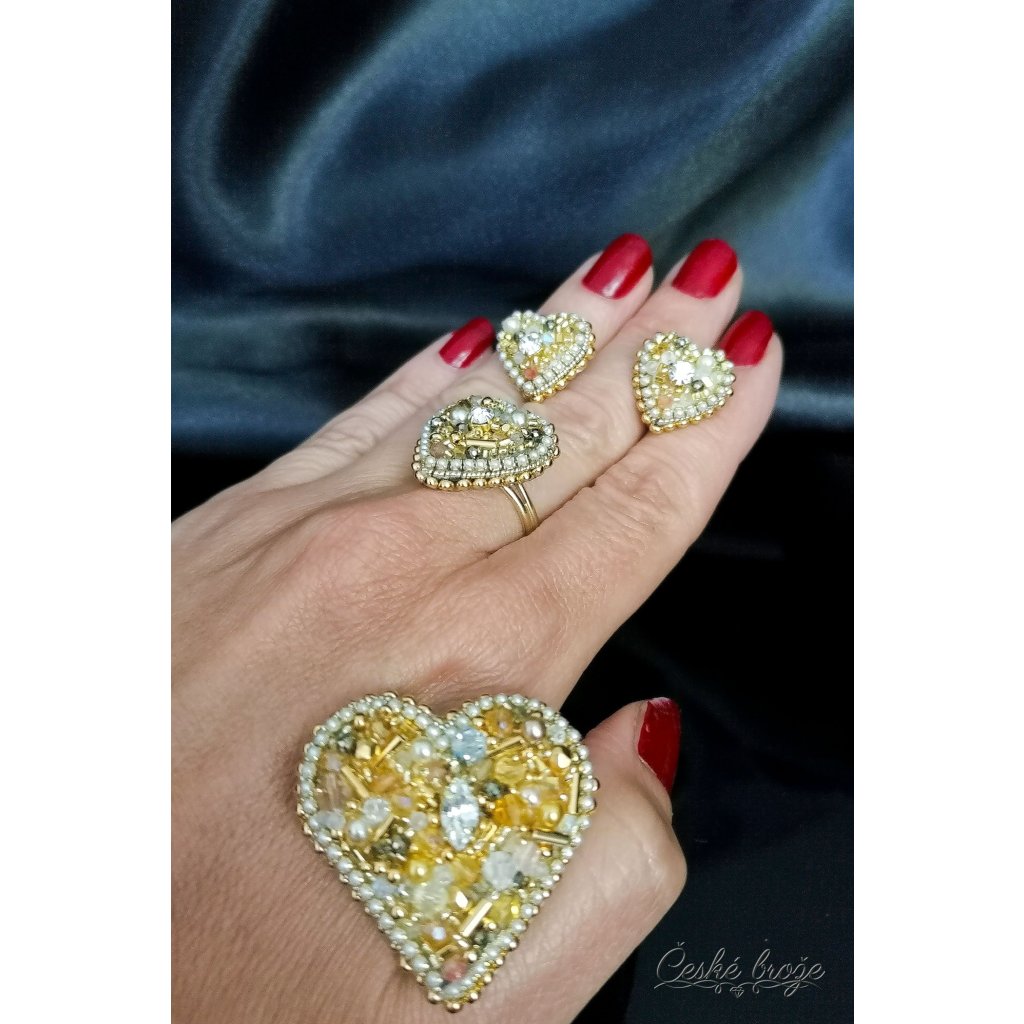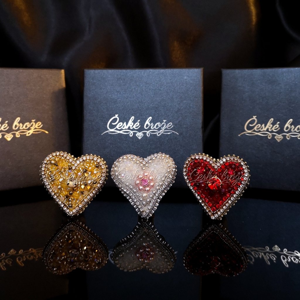Česká brož Zlaté srdce patří do kolekce, kterou jsem nazvala "Ze srdce pro Tebe". Do této kolekce postupně přidávám dle vašich přání další šperky ve tvaru srdce (další České brože, náhrdelníky, prsteny a náušnice), jen se budou lišit barvou a zasazenými perlemi, perličkami, krystaly a minerály. Pokud si přejete celý tento set nebo jen některý šperk z něj v této zlaté variantě, vložte jej do košíku a pokračujte dle instrukcí. Pokud si přejete jinou barevnou variantu, vložte tento šperk do košíku a do poznámky napište Vaše přání nebo mě kontaktujte telefonicky.